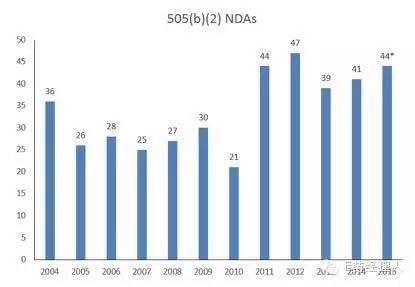 在美國,2014年FDA按照505(b)(2)途徑批準(zhǔn)了41個藥物,2015年保持強(qiáng)勁勢頭,44個藥物得到批準(zhǔn)。下圖為2004-2015年按照505(b)(2)途徑批準(zhǔn)藥物情況。