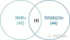 2015年FDA新藥批準(zhǔn)數(shù)量有很大提升,共有45個新藥獲得批準(zhǔn),而按照505(b)(2)途徑批準(zhǔn)的藥物數(shù)量與新藥批準(zhǔn)的數(shù)量基本相當(dāng)。在45個新藥中,有4個是通過505(b)(2)途徑批準(zhǔn)的,如下圖所示。