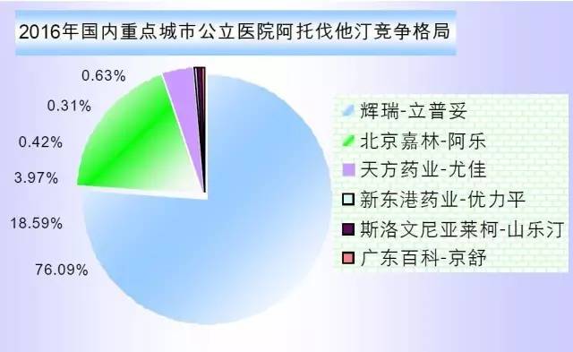據(jù)HDM系統(tǒng)數(shù)據(jù)顯示,2016年國內(nèi)重點城市公立醫(yī)院阿托伐他汀市場中,輝瑞的立普妥居于首位,占據(jù)76.09%的份額,北京嘉林占據(jù)18.59%份額,天方藥業(yè)占據(jù)3.97%份額,新東港藥業(yè)、斯洛文尼亞萊柯和廣東百科等3家占據(jù)1.35%的份額,值得一提的是,后3家企業(yè)銷售額的增長率較高,分別為178.20%、65.95%和116.48%。