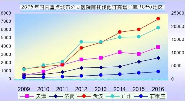 2016年國內(nèi)阿托伐他汀用藥TOP 5區(qū)域依次是北京、廣州、上海、武漢和重慶,占據(jù)16個城市中65.83%的市場份額,仍是主要消費地區(qū)。從增長率角度分析,高增長率的TOP 5區(qū)域依次是天津、濟南、武漢、廣州和石家莊,同比2015年分別增長26.32%、22.92%、22.24%、21.42%、18.02%,是帶動阿托伐他汀市場增長的主要動力。