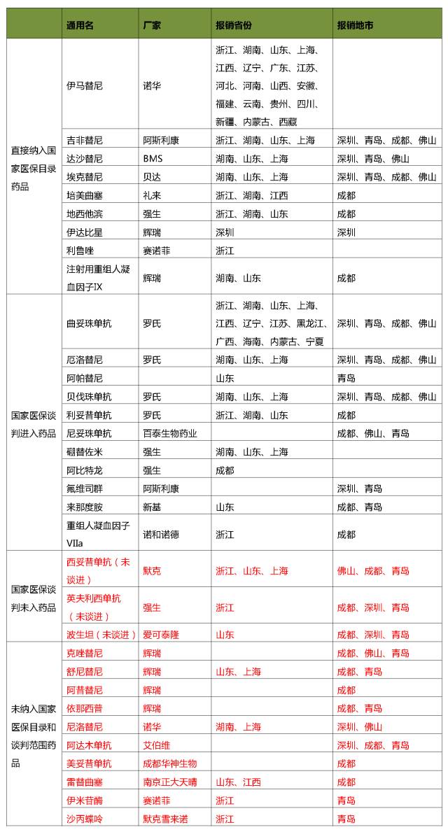 根據(jù)地方政府部門公開文件不完全統(tǒng)計(除伊馬替尼和曲妥珠單抗,其他品種統(tǒng)計省市/地市僅為浙江、湖南、山東、上海、成都、深圳、佛山、青島、江西)