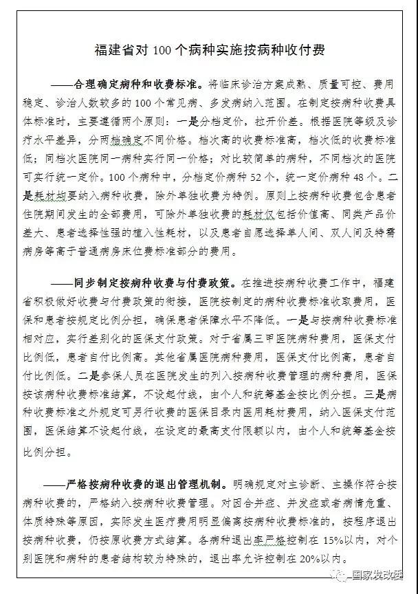——全面推進(jìn)按病種收費(fèi)改革。2011年啟動(dòng)了按病種收費(fèi)方式改革試點(diǎn)工作,遴選了104個(gè)常見病和多發(fā)病病種,供各地開展按病種收費(fèi)改革試點(diǎn)。2017年,在總結(jié)各地前期改革經(jīng)驗(yàn)的基礎(chǔ)上部署各地全面推進(jìn)按病種收費(fèi)改革工作,公布了320個(gè)病種目錄,供各地推進(jìn)按病種收費(fèi)時(shí)選擇。明確規(guī)定二級(jí)及以上公立醫(yī)院都要選取一定數(shù)量的病種實(shí)施按病種收費(fèi),所有城市2017年底前實(shí)行按病種收費(fèi)的病種不少于100個(gè)。目前,已有15個(gè)省份開展了按病種收費(fèi)改革,福建、湖南、天津、重慶、青海等省試點(diǎn)病種達(dá)到100種以上。
