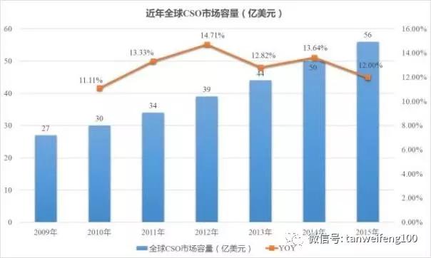 隨著醫(yī)藥銷售的“水漲”,CSO市場容量也迅猛增長。根據(jù)醫(yī)藥經(jīng)濟報的報道,2009年全球藥品CSO的市場容量大約27億美元,而到2015年則增長至56億美元。從藥企組織醫(yī)藥代表,自建銷售隊伍,到CSO的產(chǎn)生,吸引專業(yè)醫(yī)藥銷售人才,提供綜合、全方位的醫(yī)學推廣服務,CSO在全球市場的發(fā)展模式已漸趨成熟,且越來越成為藥企歡迎的銷售模式。