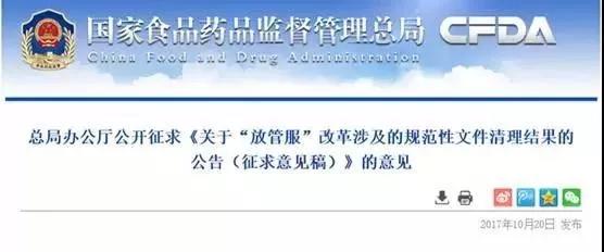 同時,食藥總局起草的《關(guān)于“放管服”改革涉及的規(guī)范性文件清理結(jié)果的公告(征求意見稿)》向社會公開征求意見。規(guī)定于2017年10月29日前,將意見反饋至電子郵箱fzszonghechu@cfda.gov.cn。