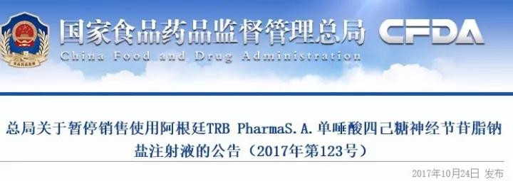 10月24日,國(guó)家食藥監(jiān)總局發(fā)布《關(guān)于暫停銷售使用阿根廷TRB PharmaS.A.單唾酸四己糖神經(jīng)節(jié)苷脂鈉鹽注射液的公告(2017年第123號(hào))》。