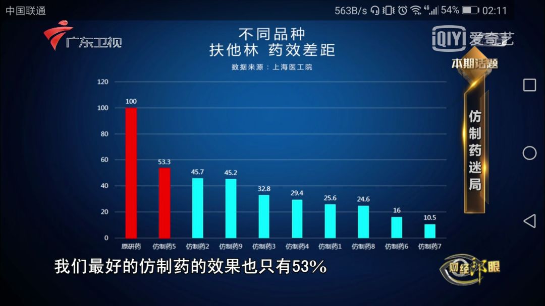 此前,《財經郎眼》頻道援引了上海某學院的數(shù)據,該機構對比了不同品種扶他林的藥效差距,其結論是最好的仿制藥的效果也只有原研藥的53%。