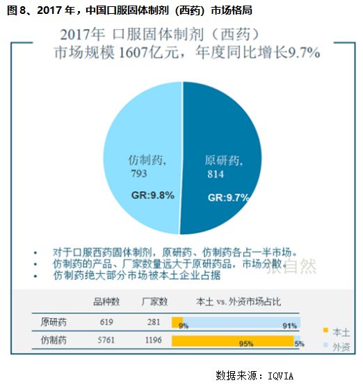既然一致性評價是先從口服劑型開始的,現(xiàn)就以口服仿制藥替代為例進(jìn)行分析,據(jù)世界知名機(jī)構(gòu)昆泰公司(IQVIA)統(tǒng)計,2017年中國百張病床及以上醫(yī)院口服用藥市場規(guī)模為1607億元,原研藥即占了814億元(>50%),而其中大部分是過了專利保護(hù)期的,可見可供仿制藥替代的市場規(guī)模足夠大。