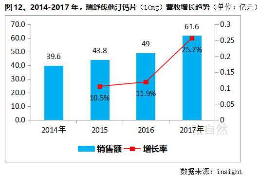 瑞舒伐他汀鈣片(10mg)的整體市場規(guī)模不算小,其2017年市場規(guī)模已達(dá)61.6億元,且增長速度也逐年上升。