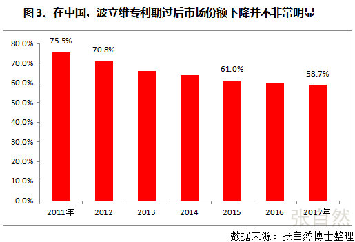 而在中國,專利到期后的當(dāng)年,波立維市場份額由高峰期的75.5%下降到70.8%,僅下降了4.7%,專利到期6年后的2017年,其市場份額仍高達(dá)58.7%,才下降了16.8%,所以說藥品專利在中國并無懸崖現(xiàn)象出現(xiàn)。