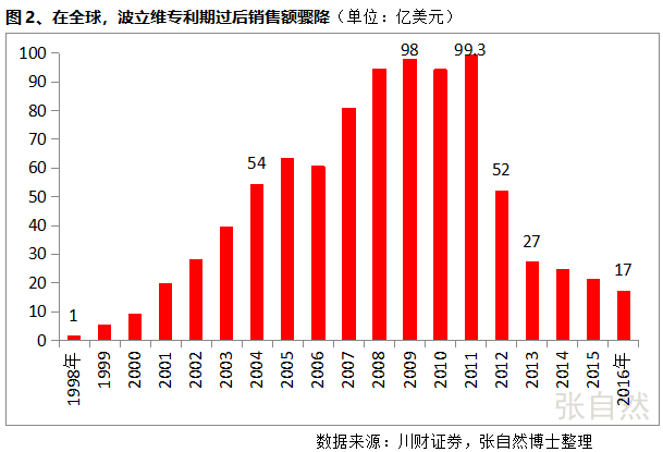 如知名藥物波立維在專利到期(2012年5月17)后的當(dāng)年銷售額即由高峰期的99.3億美元下降到52億美元,直接下降了近一半,專利過期后的第二年下降到27億美元,下降了73%。