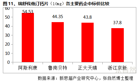 圖11列舉了目前瑞舒伐他汀鈣片(10mg)4個主要仿制企業(yè)的中標(biāo)價情況,與圖10對比可見,盡管浙江京新的中標(biāo)價最低,但其市場份額反被中標(biāo)價還高的魯南貝特超越,這表明,價格僅是競爭因素之一,營銷能力、企業(yè)品牌等其他因素也是做好銷售所必不可少的重要因素。
