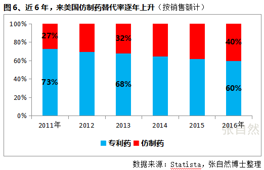 如按處方量計,美國仿制藥替代率則由2011年的73%上升到了2016年的88%。
