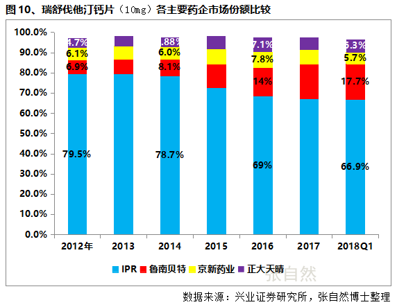 瑞舒伐他汀鈣片(10mg)盡管仿制企業(yè)不少,但每家仿制藥的市場份額都不太大,如魯南貝特和正大天晴等企業(yè)的營銷能力也不可謂不強(qiáng),但仍難撼動原研企業(yè)IPR的壟斷地位,這也是藥品專利在中國沒有懸崖的具體體現(xiàn)。