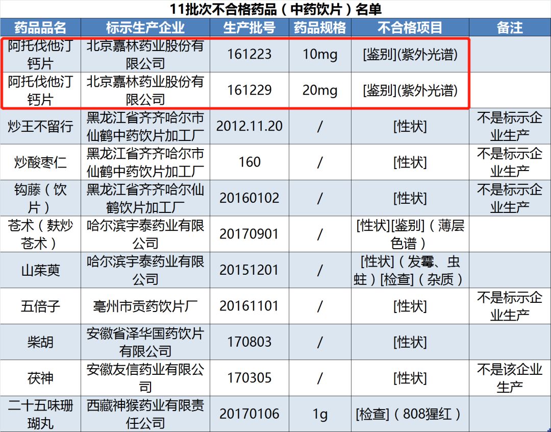值得注意的是,本次不合格的藥品中,居然有兩個批次為通過一致性評價的產(chǎn)品——北京嘉林藥業(yè)股份有限公司生產(chǎn)的批號為161223和161229的阿托伐他汀鈣片,該兩個批次的檢品來源為伊春市人民康泰醫(yī)藥連鎖有限公司悅馨堂店,不合格項目為紫外光譜。