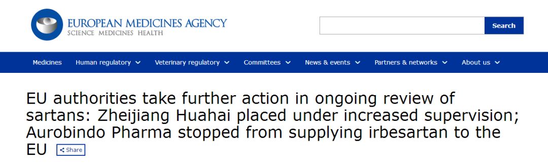 公告中顯示,歐盟當(dāng)局正在加強對中國公司浙江華海的監(jiān)管,并禁止在歐盟藥品中使用其纈沙坦。