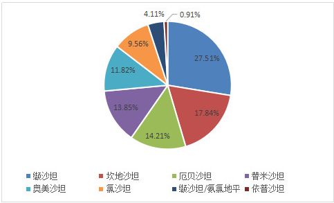 其中,纈沙坦、坎地沙坦、厄貝沙坦、氯沙坦和奧美沙坦共占據(jù)沙坦類藥物近81%的市場份額。