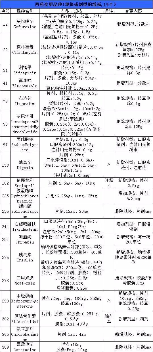 除了徹底被調(diào)出目錄,還有19個化藥品種被變更了規(guī)格或劑型。例如增加了頭孢呋辛分散片劑型,刪除了布洛芬膠囊劑型的0.1g規(guī)格。具體名單如下: