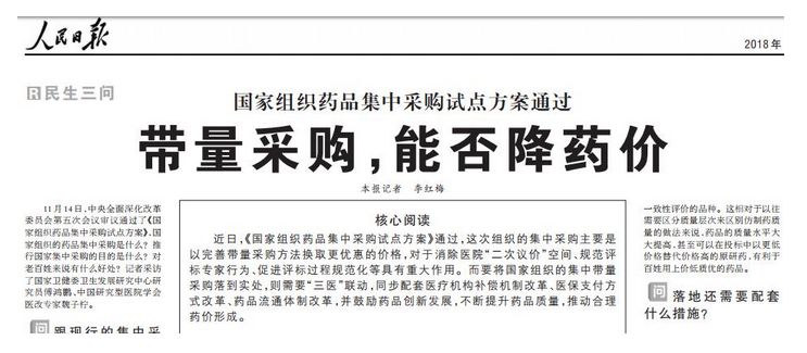 當“4+7”帶量采購頭頂“國內(nèi)藥品招標史上最大規(guī)模的跨區(qū)域聯(lián)合采購”,“國家醫(yī)保局組建后首次實施采購職能”的光環(huán)走來,關于它的一舉一動用“全國矚目”形容已不為過,甚至《人民日報》也發(fā)出關于“帶量采購,能否降藥價”的民生三問。