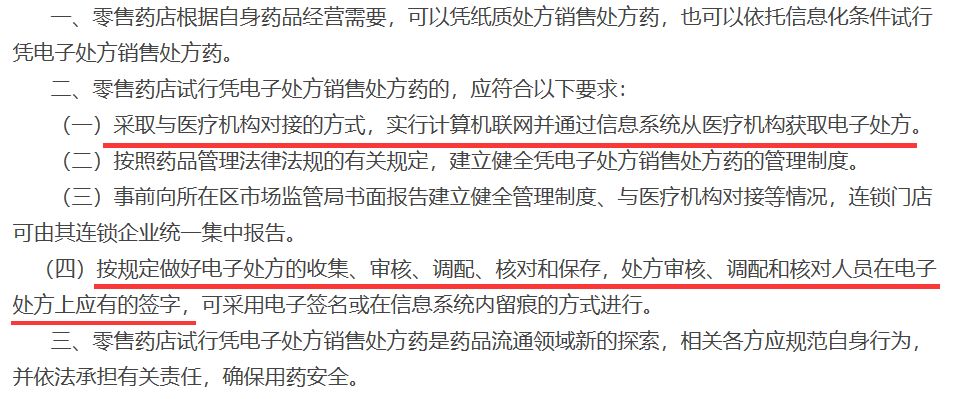 結(jié)合天津市關(guān)于零售藥店試行憑電子處方銷售處方藥的文件來(lái)看,藥店要從醫(yī)療機(jī)構(gòu)獲取電子處方,處方審核、調(diào)配、核對(duì)也需配合以上要求。