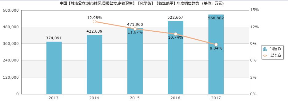 米內(nèi)網(wǎng)數(shù)據(jù)庫(kù)顯示,近兩年氨氯地平的市場(chǎng)增速放緩,但由于降壓藥市場(chǎng)需求巨大,依然保持平穩(wěn)增長(zhǎng),2017年市場(chǎng)規(guī)模高達(dá)56.88億元。