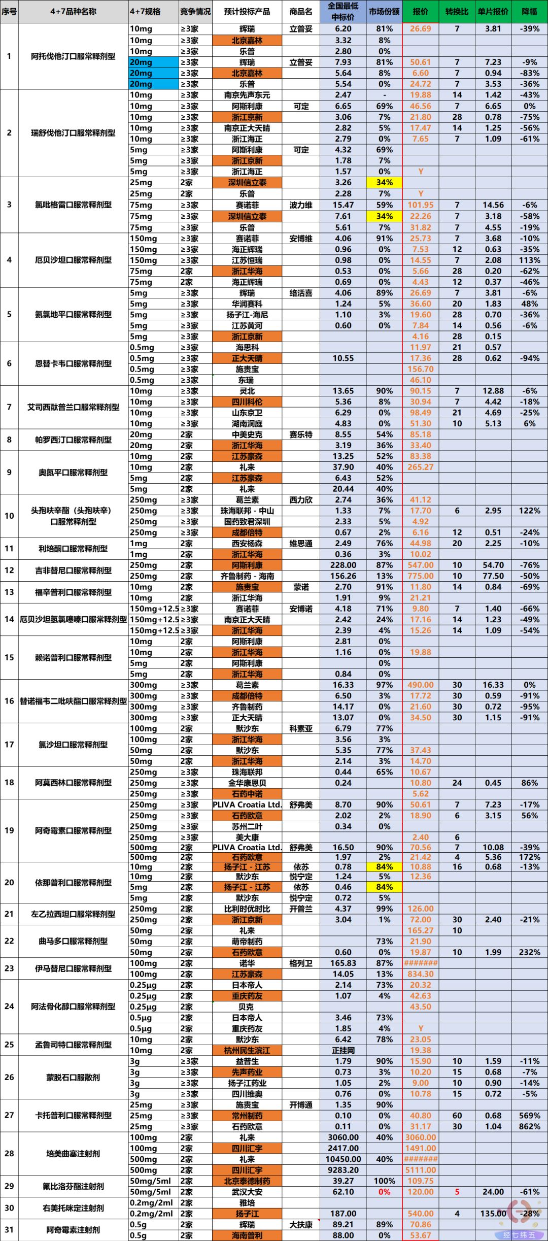 價(jià)格方面,未中選品種也需要根據(jù)與中選價(jià)的價(jià)差實(shí)現(xiàn)梯度降價(jià)后(以中選價(jià)托底)方可繼續(xù)采購使用,對(duì)比各廠家原平均價(jià)格,非中選品種也將面臨價(jià)格跳水。