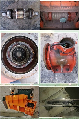 下圖電機(jī)因缺油阻力加大,形成過載燒壞;電機(jī)兩側(cè)偏心塊調(diào)節(jié)出現(xiàn)問題而發(fā)生搖擺,剪切橡膠彈簧燒壞硫化;因預(yù)埋吊點(diǎn)和安裝問題出現(xiàn)吊鉤斷裂,電機(jī)過載;電機(jī)螺栓松動(dòng)形成給料量下降,電機(jī)過載燒壞等問題。