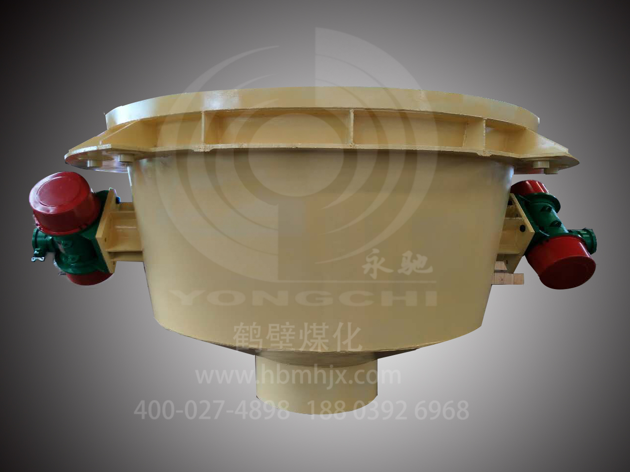 該機(jī)的工作原理是:對稱置于槽體直徑兩端的振動電機(jī)是該機(jī)的振動源,在有角度安裝的振動電機(jī)啟動后,槽體在激振力與平衡彈簧的作用下產(chǎn)生渦旋振動,使物料呈渦流狀迅速下移到出料口,以實(shí)現(xiàn)給料的目的。